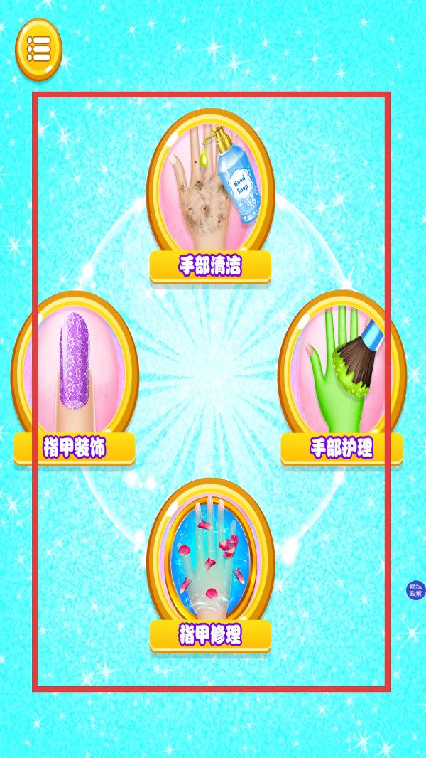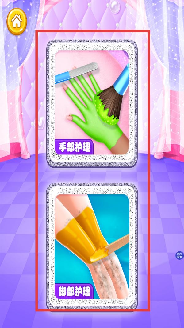 1、進入芭比公主美甲主界面,面對手部護理和腳部護理兩個選項卡,點擊手部護理選項卡,進入手部護理流程。