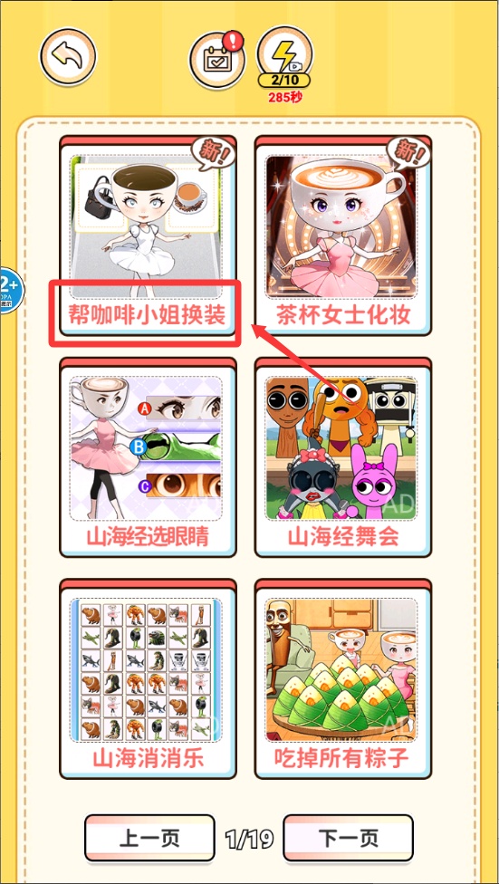 3、進入"咖啡小姐"互動界面后,從左側衣柜挑選喜歡的服飾,通過拖拽方式為小姐姐搭配不同風格的造型。