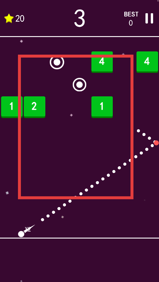 2、游戲過程中發射小球,借反彈撞擊方塊,方塊數字歸0即消除,規劃彈射路徑。