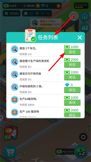 4、打開任務列表界面,查看各類任務進度,點擊對應任務的前往按鈕,完成建造生產等任務,獲取對應的貨幣或鉆石獎勵。