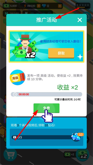 2、打開推廣活動界面,點擊免費按鈕參與高級活動,可讓收益翻倍,效果持續10分鐘,還能通過觀看視頻領取鉆石獎勵。