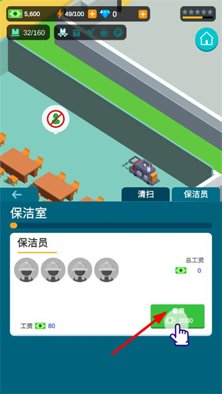 3、進入保潔室界面,消耗2000貨幣點擊雇傭按鈕,聘請保潔員,負責場地的清潔工作,助力場地的日常運營維護。