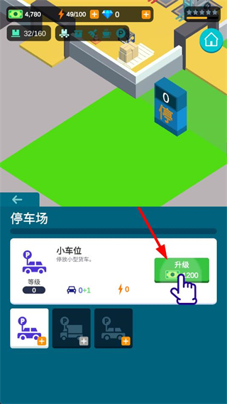 1、在停車場界面找到小車位,消耗200貨幣點擊升級按鈕,提升車位等級,解鎖更多小型貨車的停放權限。