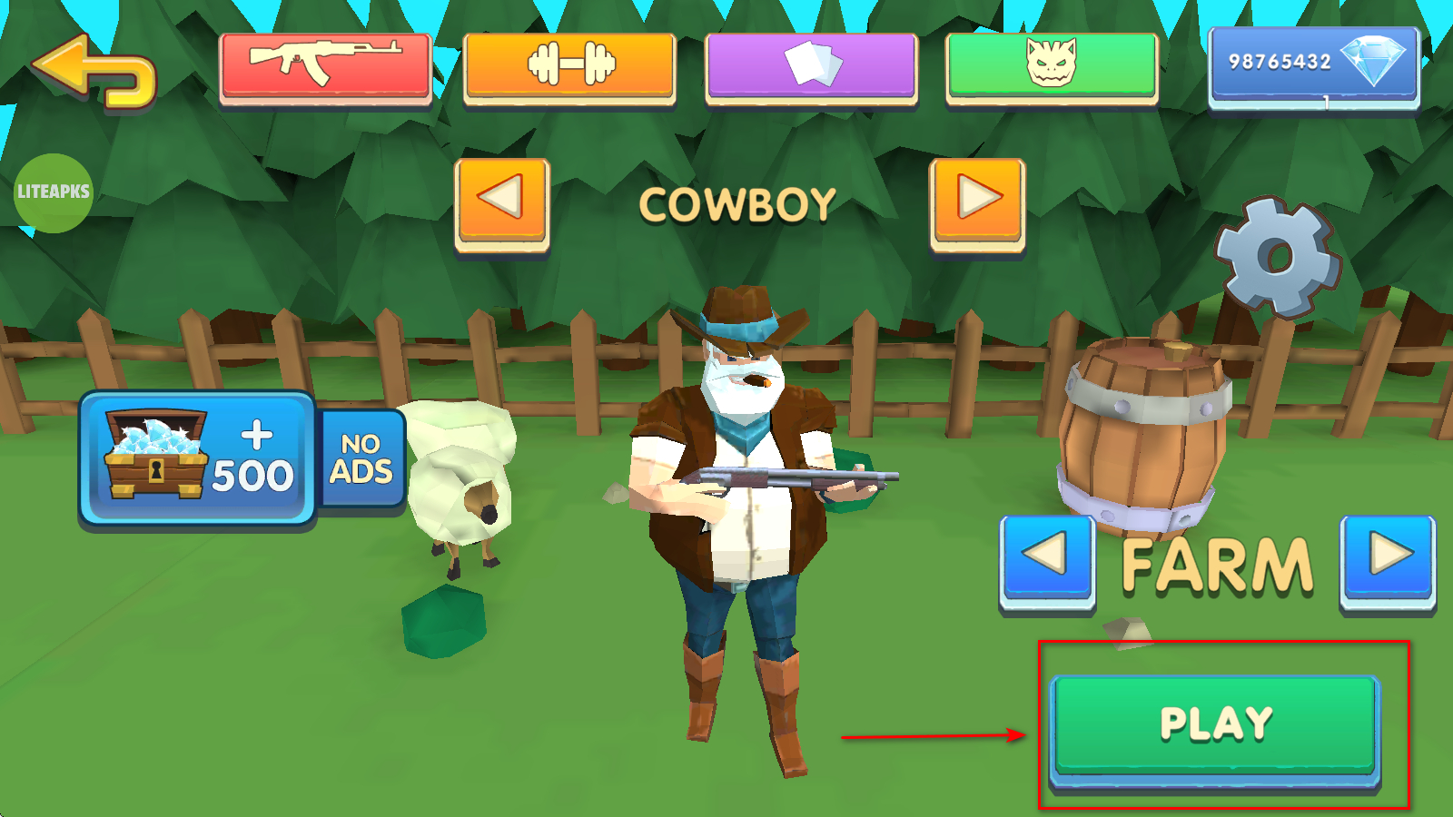 1、在初始界面點擊綠色PLAY按鈕,進入游戲場景,操控牛仔角色,通過左下角虛擬搖桿移動,探索草地地圖。