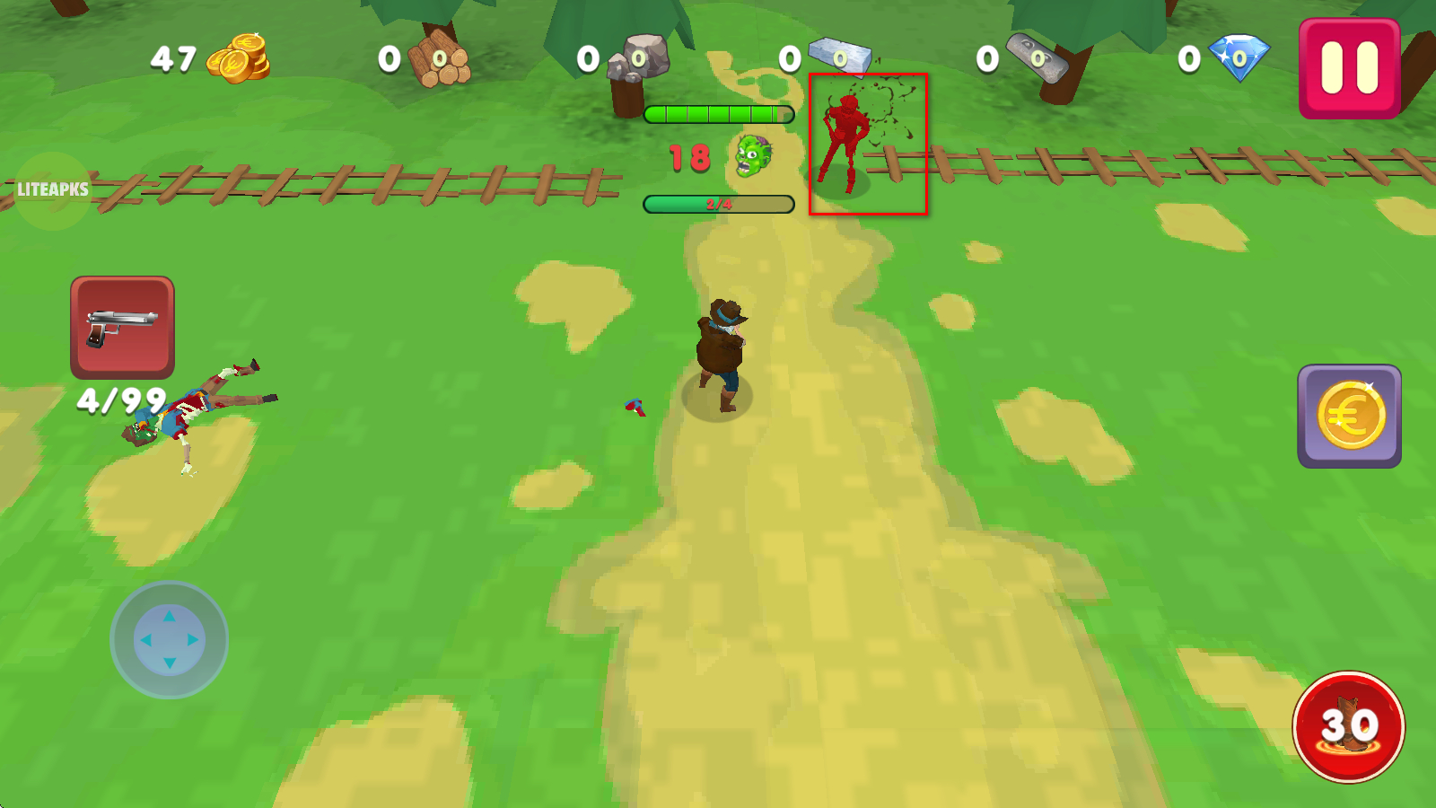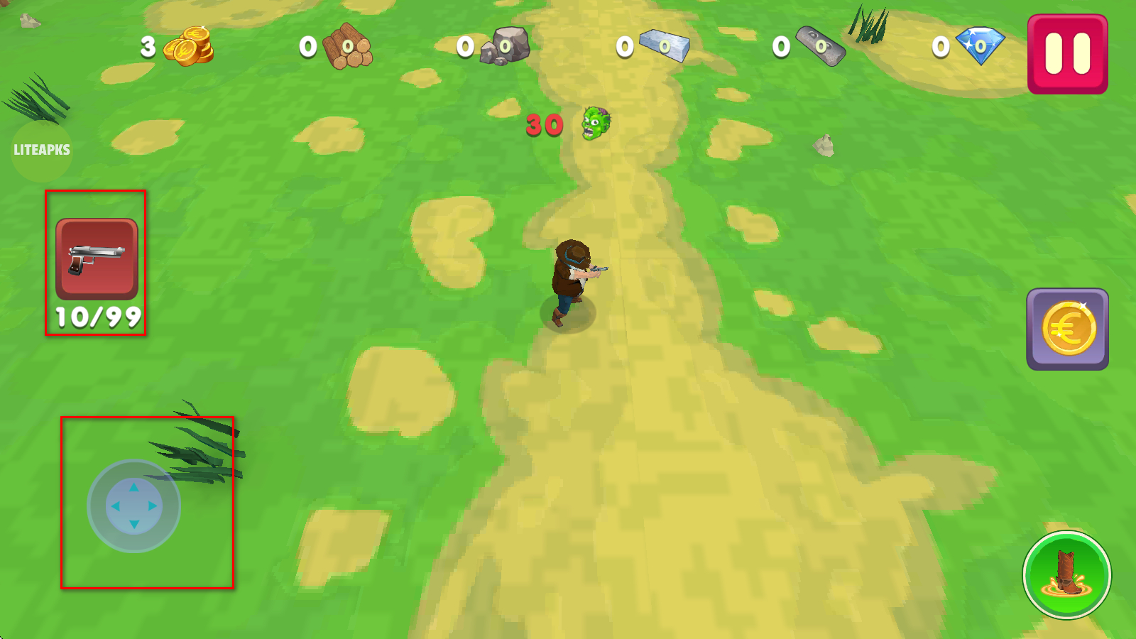2、遇到怪物時,點擊左側武器圖標,瞄準目標進行射擊,消滅怪物可獲金幣、資源,用于后續升級或購買道具。