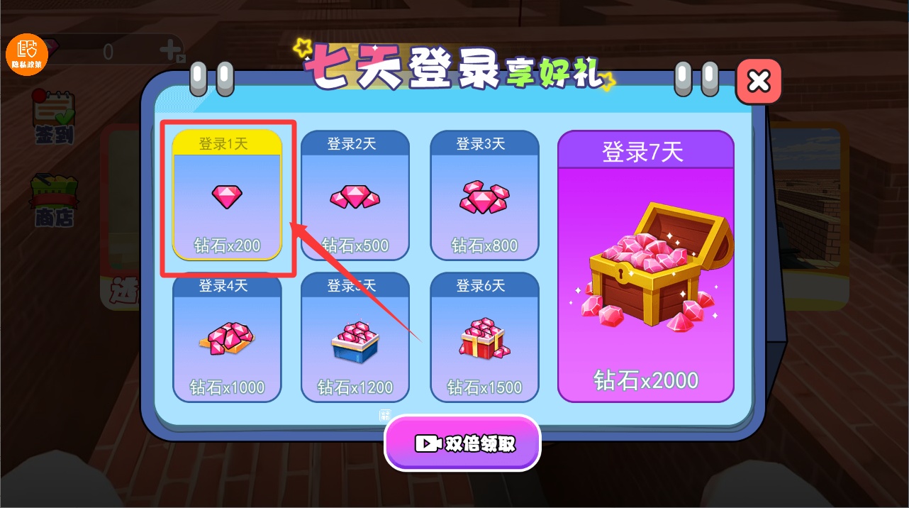 2、在每日登錄界面中,選擇"第一天"選項領取專屬新手獎勵,獲取游戲初始資源。