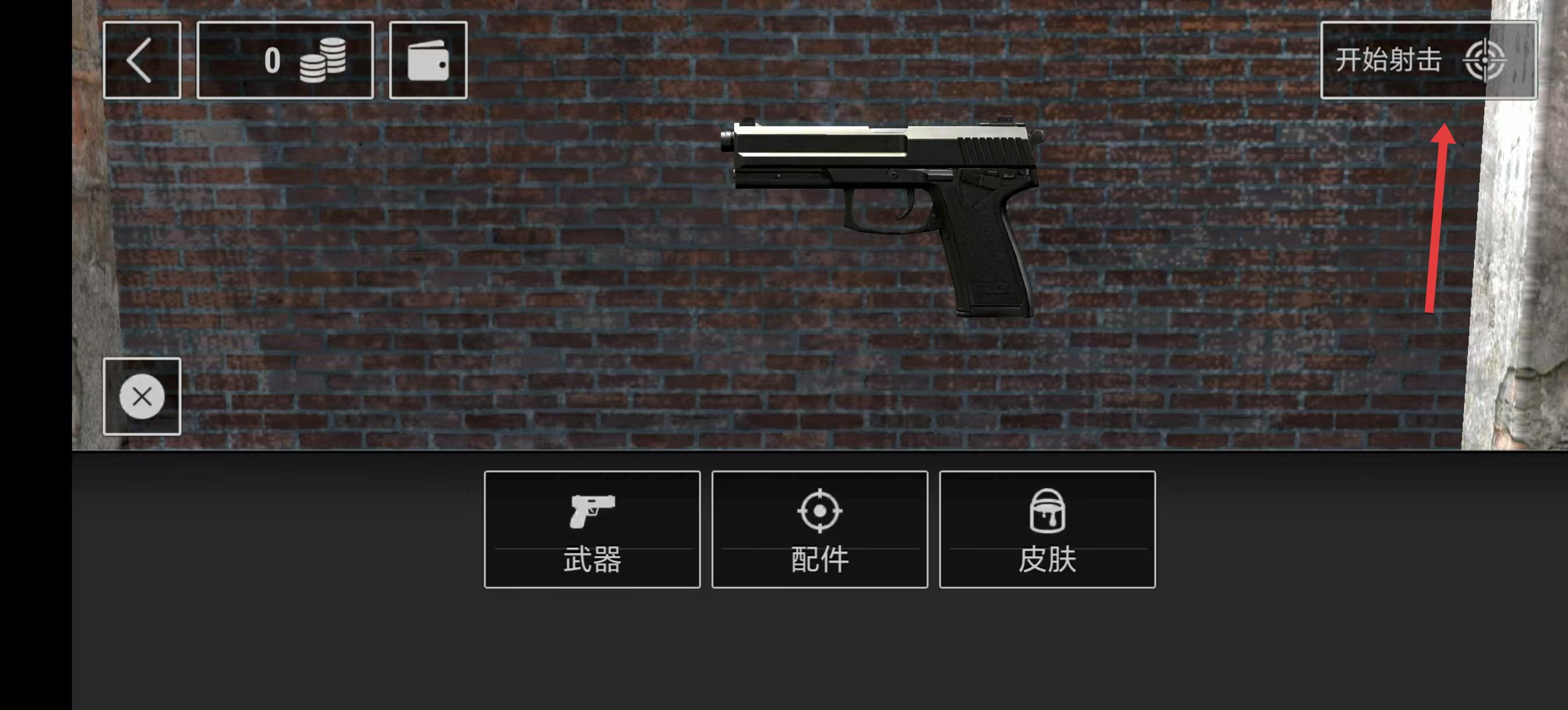 2、進入武器界面,展示手槍,點擊開始射擊,進入射擊準備環節,可查看武器、配件、皮膚等選項。