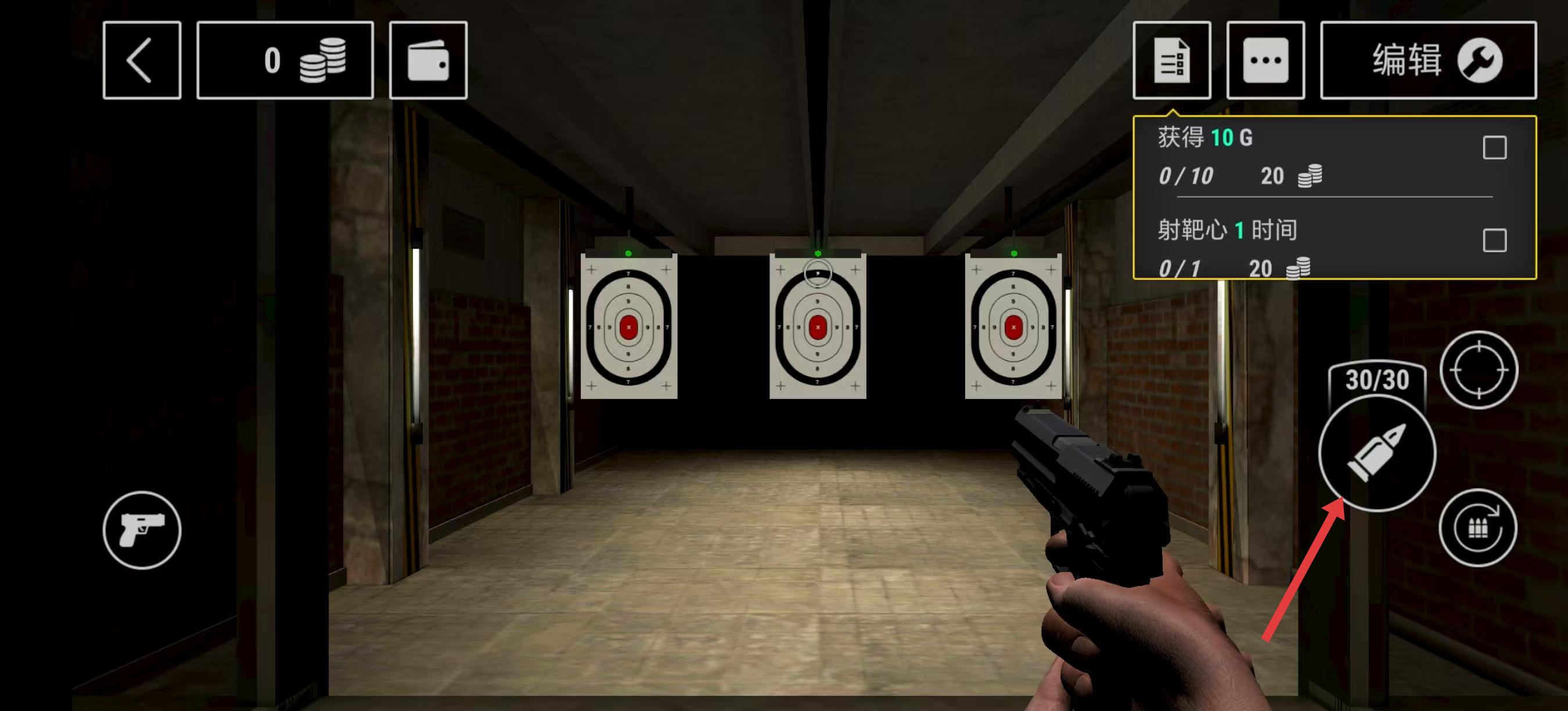 3、進入射擊靶場,手持手槍瞄準靶心,點擊射擊按鈕,擊打目標,完成射靶任務,推進闖關進程。