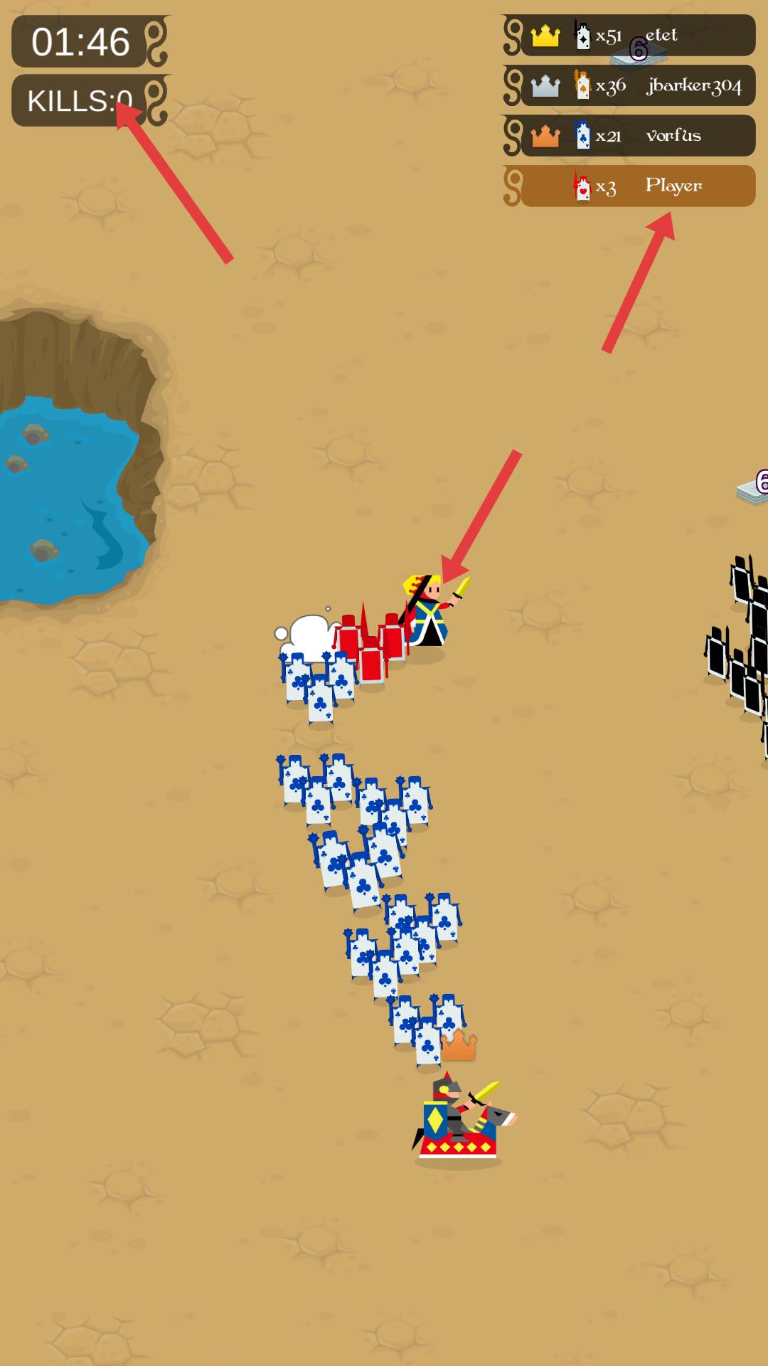3、對戰時,關注左上角時間和擊殺數,以及右上角玩家排名,指揮卡牌隊伍與敵方交戰,通過擊敗敵人提升排名,同時積累經驗,增強卡牌戰力。