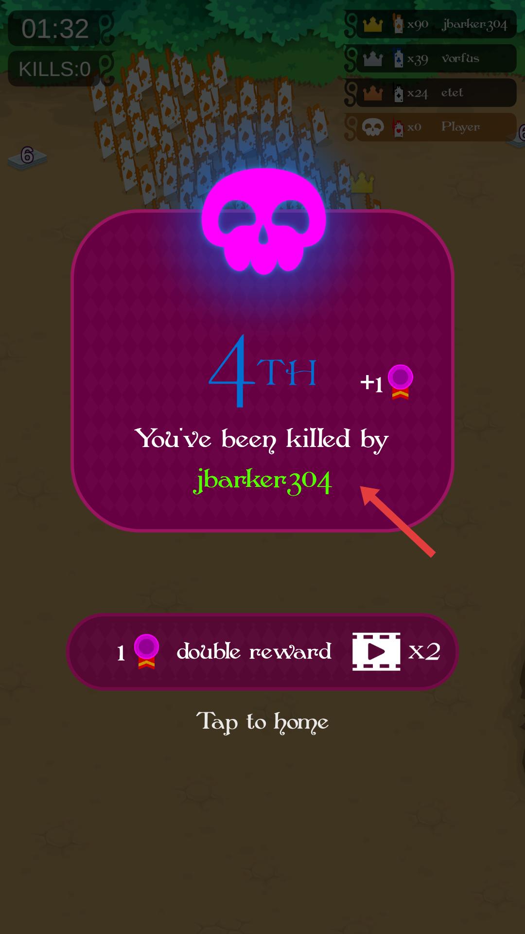4、若被其他玩家擊敗,界面會顯示排名和擊敗者信息,此時可點擊箭頭所指處返回主界面,總結失敗經驗,調整策略,準備下一次卡牌對戰。