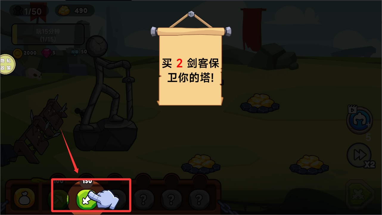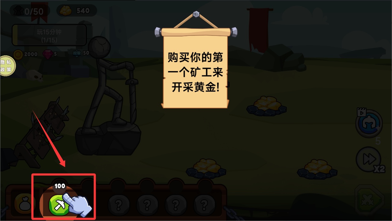 2、進入商店界面花費初始金幣雇傭礦工,這些基礎單位會自動采集金礦資源,為后續發展提供穩定的經濟來源。
