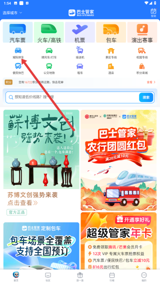 1、打開巴士管家APP,在首頁點擊城際拼車選項,進入跨城出行專屬定制頁面,開啟跨城出行規劃。