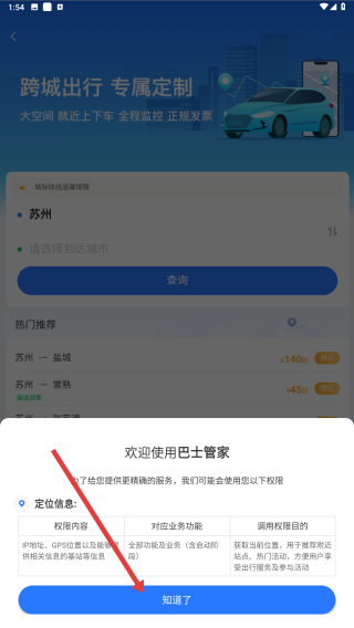 2、跨城出行頁面,會彈出定位權限提示框,點擊知道了,確認權限使用,以便獲取更精準的服務。