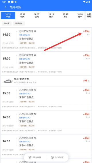 4、點擊查詢后,會展示出不同時段、不同價格的跨城出行班次,可根據需求選擇合適的班次進行預訂。
