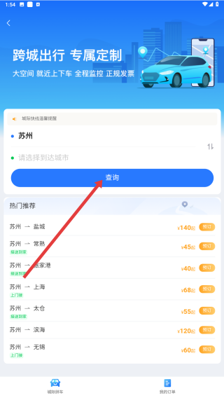 3、確認權限后,在跨城出行頁面選擇出發地和到達城市,然后點擊查詢按鈕,查找相關的跨城出行班次。