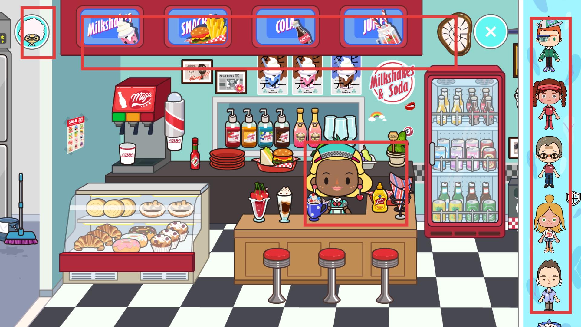 1、點擊紅框角色,可開啟互動,比如接收制作奶昔、漢堡等餐食的訂單任務,完成后獲取獎勵,推動餐廳經營劇情。