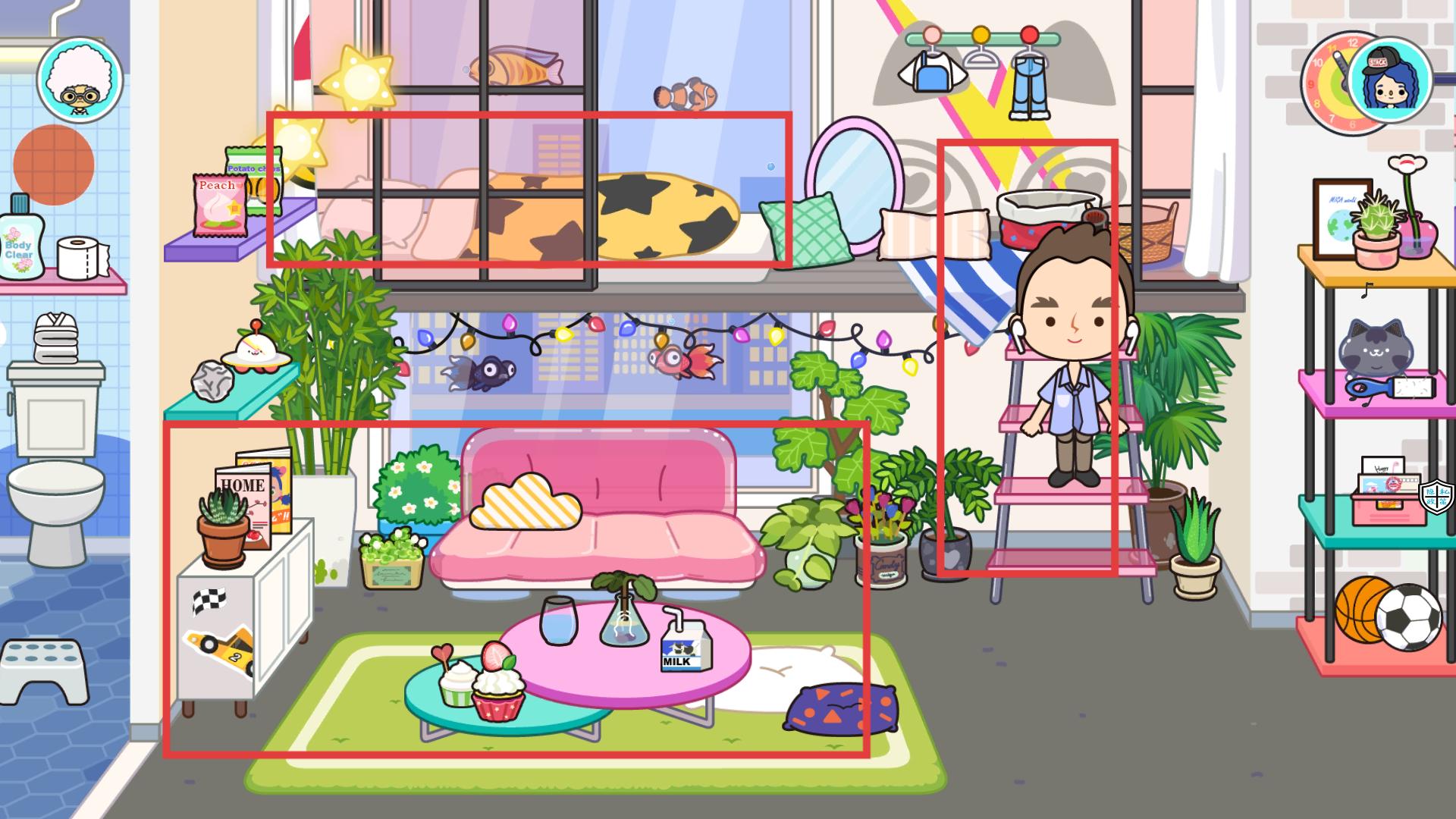 2、將紅框角色拖動到不同紅框區域,像布置床鋪、整理客廳,可解鎖區域專屬互動,如在床上休息恢復體力讓角色狀態更新。