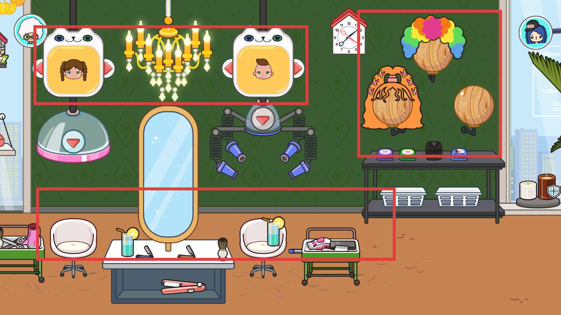 3、操作紅框里的美發設備,把角色放到造型椅,選取墻上紅框發型模具,為其設計對應發型,完成美發服務解鎖新造型。