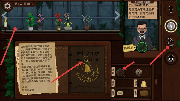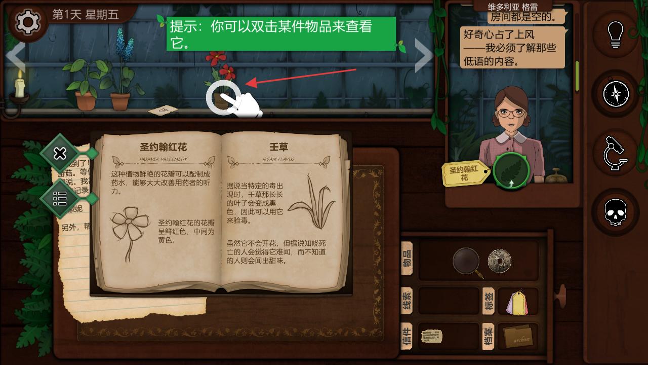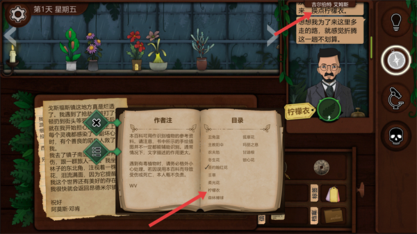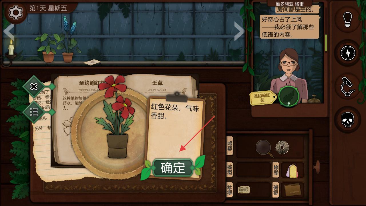 1、查看書本目錄,找到圣約翰紅花條目,結合信件內容,推進與神秘漫游菇、圖書館相關的探索任務。