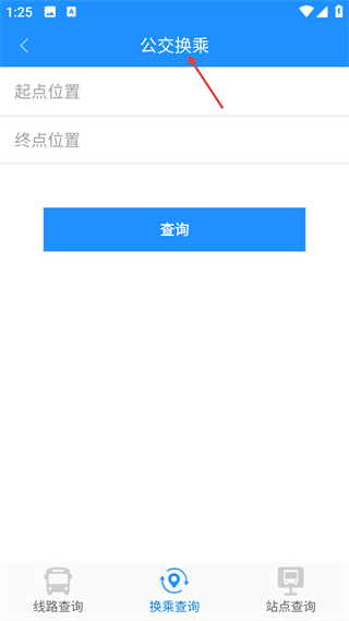 3、公交換乘頁面需輸入起點與終點位置,點擊查詢獲取換乘方案,同時支持線路及站點查詢功能。