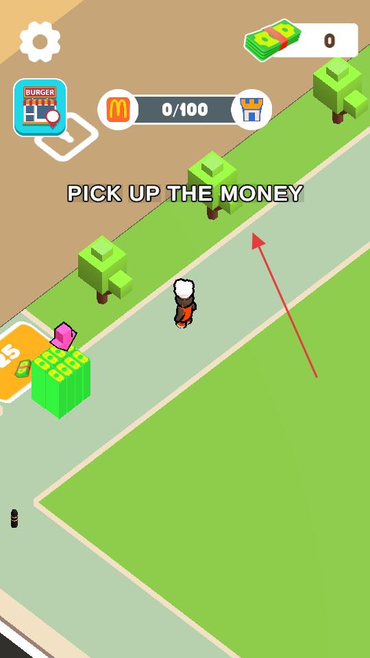 1、進入游戲先按指引【撿錢】,積累初始資金,沿道路移動角色,收集散落鈔票,關注上方任務進度。