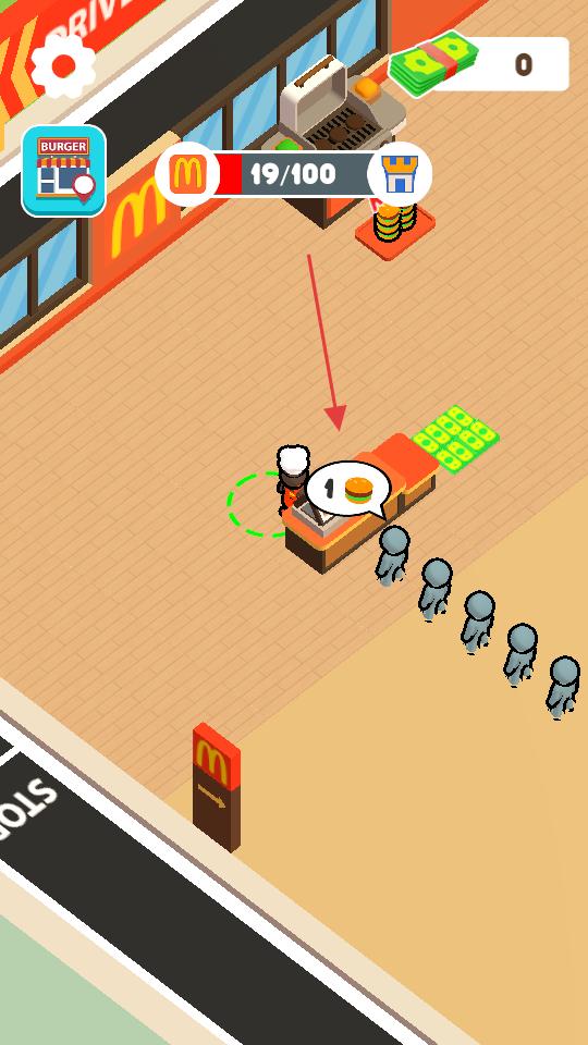 3、前往漢堡制作區,根據顧客訂單制作食物,快速服務排隊顧客,積累收益升級店鋪,解鎖更多經營內容。