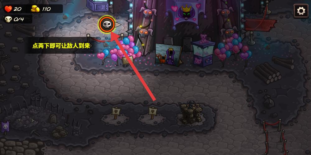 4、戰斗界面中左上角血量20、金幣110清晰,骷髏圖標旁寫著點兩下即可讓敵人到來,防御塔已就位,玩家即將觸發敵人進攻,開啟塔防激戰。