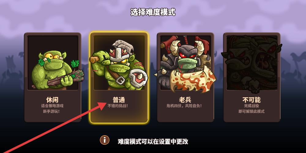 3、難度選擇界面列著休閑、普通、老兵、不可能,普通模式卡片閃著黃光,標注不錯的挑戰,還提示難度可改,幫玩家選定對戰強度。