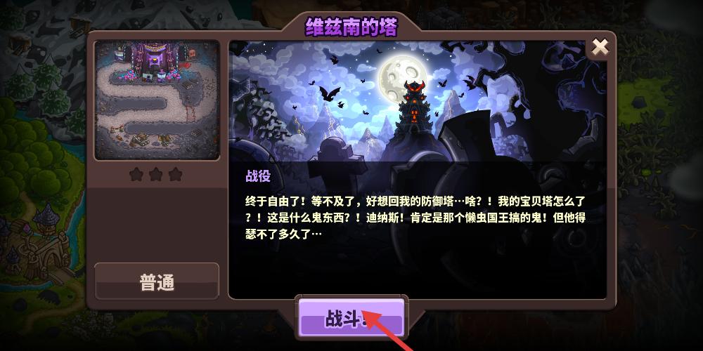 2、關卡界面聚焦維茲南的塔,左側地圖縮略展現路徑,右側劇情文字吐槽塔的異變,戰斗按鈕醒目,點擊即投身這場塔防對決。