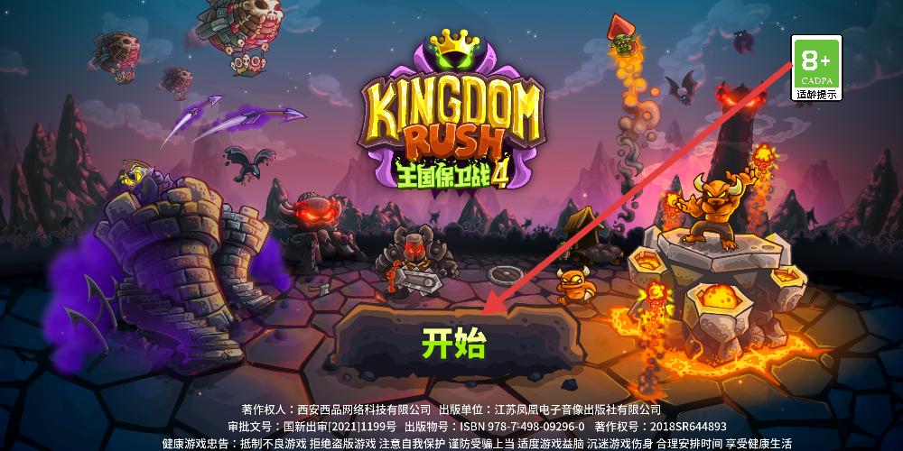 1、啟動界面奇幻感拉滿王國保衛戰4標題亮眼,背景怪物與魔法紛飛,中間開始按鈕靜候觸碰,召喚玩家踏入塔防戰場。