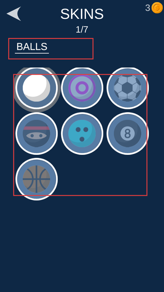 4、進入SKINS界面,可選擇不同外觀的球體,如足球、保齡球等樣式,用游戲中獲得的金幣解鎖,更換球體外觀。