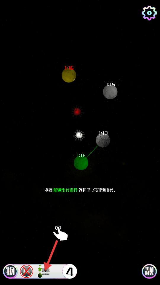 3、游戲界面左下角有物按鈕,點擊展開道具欄,當擁有加速道具時,根據戰斗需求將加速出兵道具拖拽到己方星球上,就能加快該星球的出兵速度。