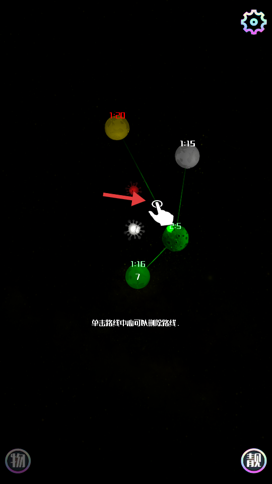 2、進入游戲畫面綠色星球代表玩家,按照提示點擊并拖拽綠色星球到其他星球上,即可生成進攻路線,合理規劃進攻路線,搶奪資源或占領地盤。
