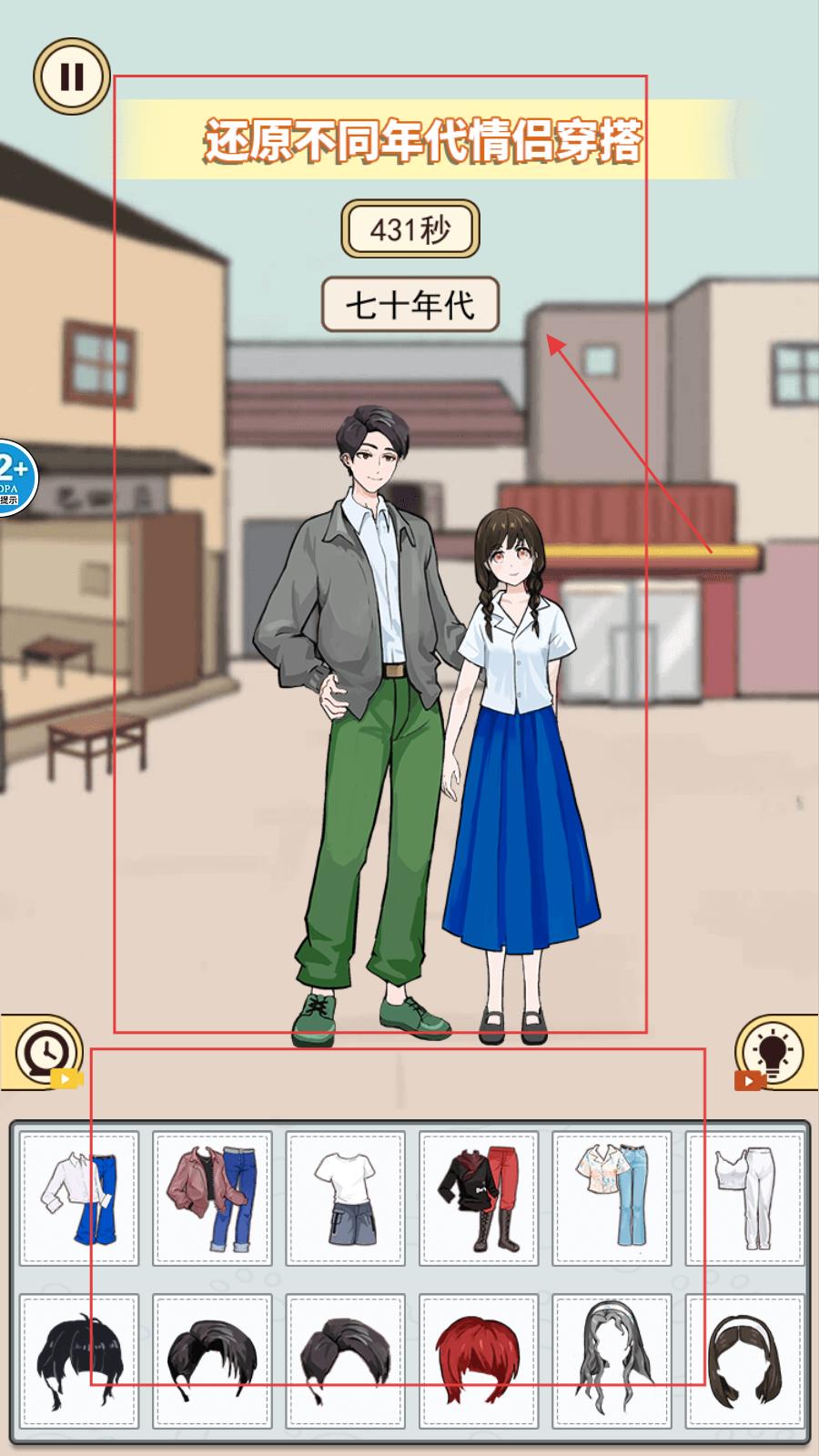 1、進入還原穿搭關卡,第一個是七十年代,界面有男女角色模型和下方的服裝、發型選項,需為角色搭配符合的穿搭。
