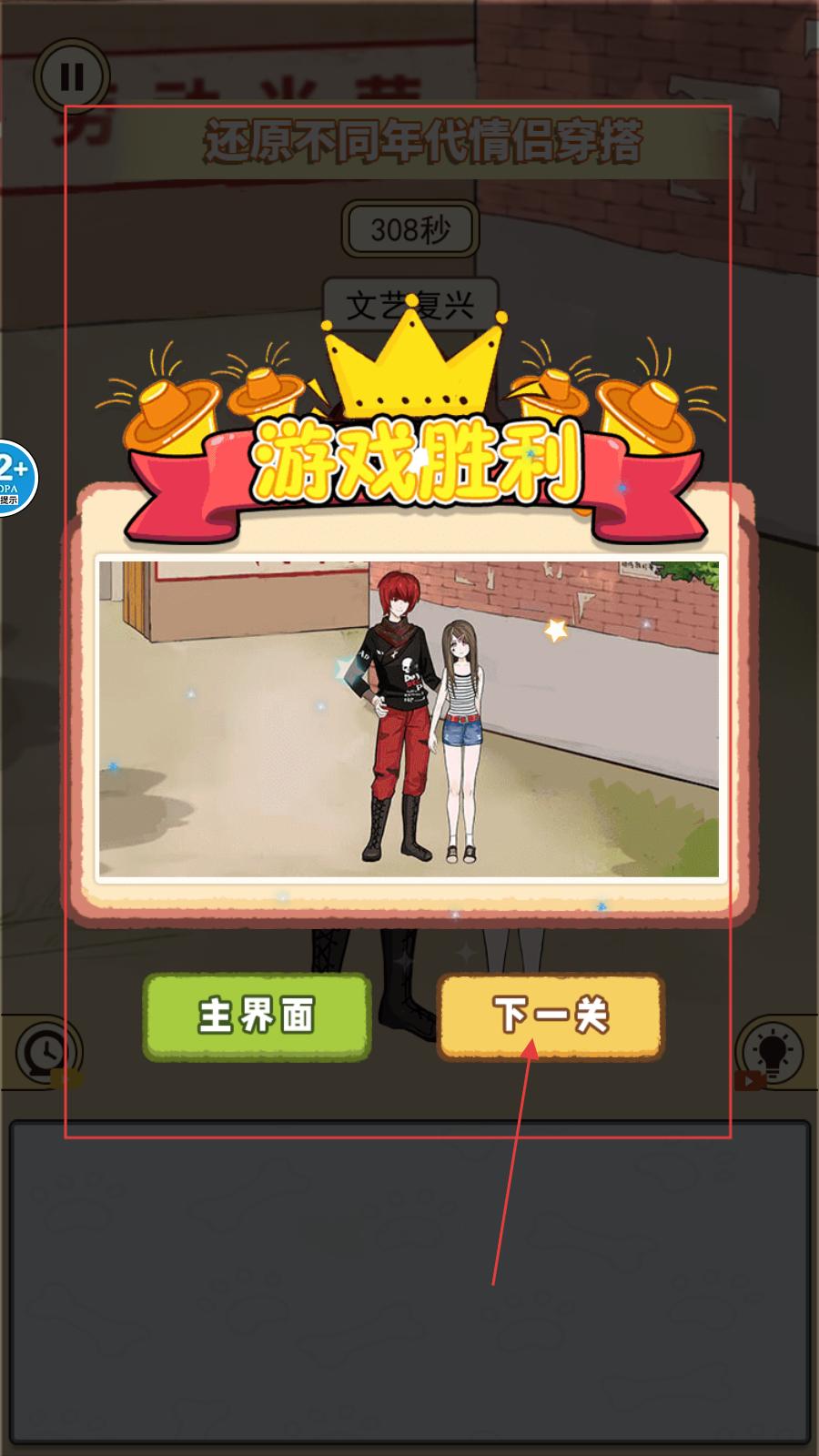 4、在成功搭配好各年代情侶穿搭后,游戲會顯示【游戲勝利】,可選擇點擊【下一關】繼續挑戰其他年代的穿搭還原。