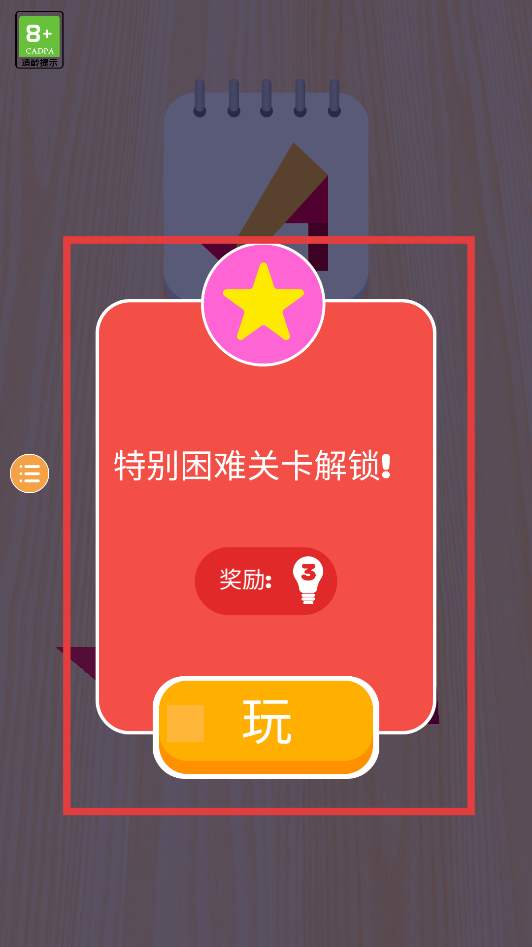 4、圖案拼接完成后,等待游戲判定,若判定通過會彈出關卡解鎖提示界面,提示特別困難關卡解鎖并顯示獎勵內容,點擊玩按鈕即可進入解鎖的特別困難關卡繼續游戲。