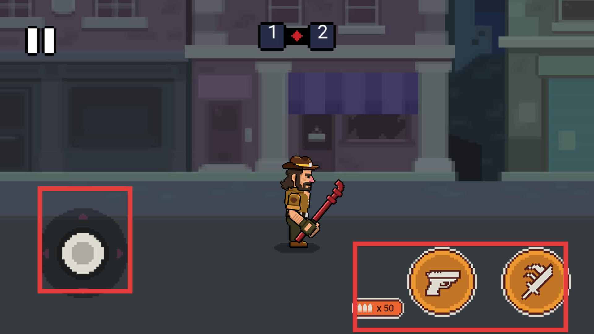 2、在游戲戰斗場景,左側有虛擬搖桿用于控制角色移動,右側有槍械和近戰武器的操作按鈕,上方顯示當前波數,操控虛擬搖桿移動角色。