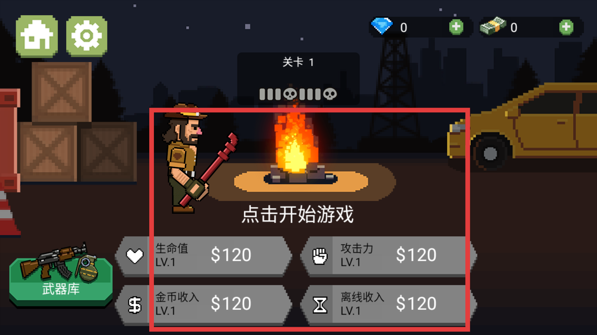 1、進入牛仔大戰僵尸,界面顯示角色初始屬性,還有點擊開始游戲提示,以及武器庫入口和鉆石、金幣數量,點擊【點擊開始游戲】按鈕,進入游戲戰斗場景。