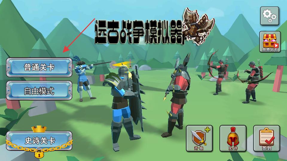 1、游戲的主界面,有普通關卡、自由模式、史詩關卡選項,還有升級、史詩、簽到功能按鈕。