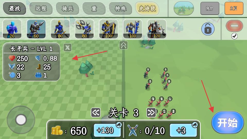 2、可選擇史詩級等不同類型士兵,比如1級長矛兵生命值250等屬性,下方金幣650、劍數量,右側有開始按鈕。