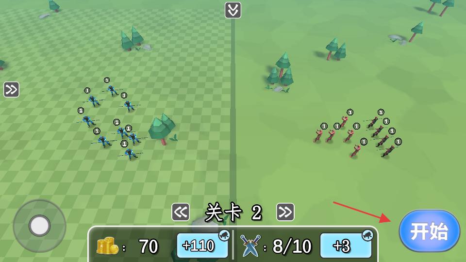 3、游戲戰斗準備頁面,布陣好我方戰士,對面兩側有紅色陣營的士兵,點擊右下角的開始按鈕即可開始戰斗。