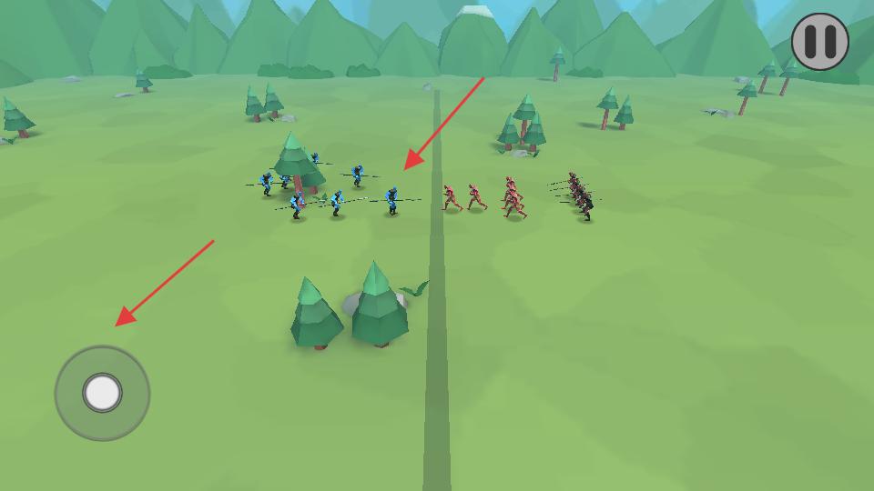 4、游戲戰斗場景中藍色和紅色陣營的士兵在草地上對峙,左側有操作按鈕,背景是山林,戰斗一觸即發。