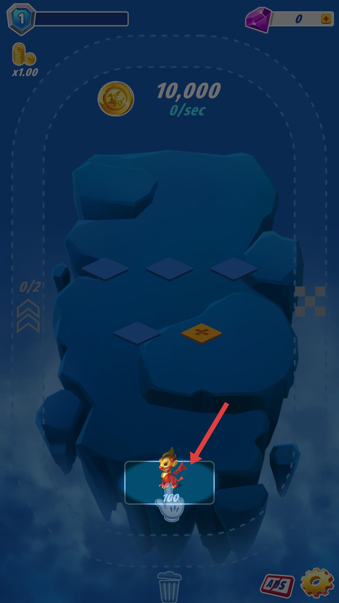 1、游戲初始界面有小龍和金幣等元素,點擊下方顯示的小龍,可讓小龍放置到場景中的地塊上,開始游戲內的相關操作,推進游戲進程。