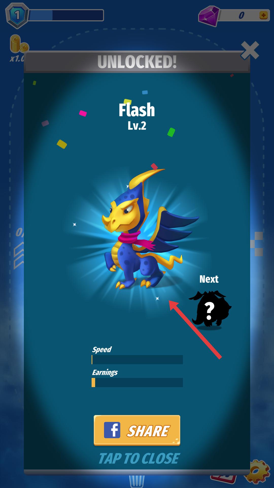 4、合成到一定程度后會解鎖新的小龍,如界面顯示的等級為2的龍,解鎖后可查看新小龍的速度、收益等屬性,繼續后續的合成與解鎖,豐富小龍種類。