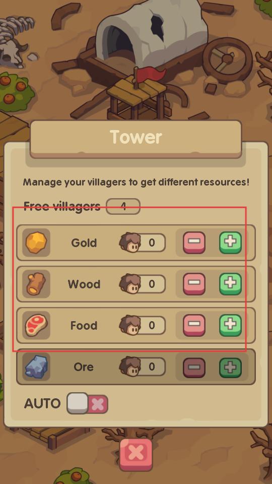 3、可進入塔樓相關界面,這里能管理村民獲取黃金、木材、食物等資源,通過點擊加減按鈕分配村民,收集生存所需物資。