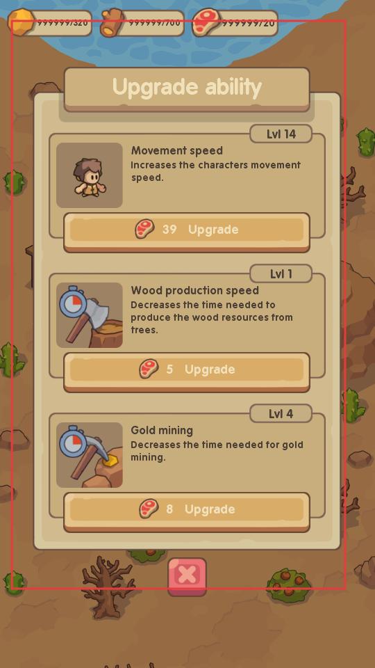 4、還有能力升級界面,能提升移動速度、木材生產速度、黃金開采速度等,消耗對應物資點擊升級按鈕,增強生存能力。