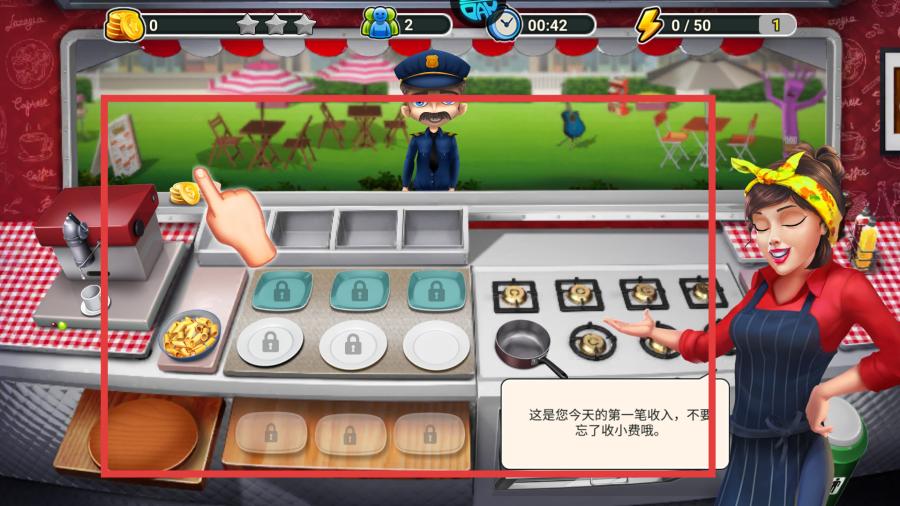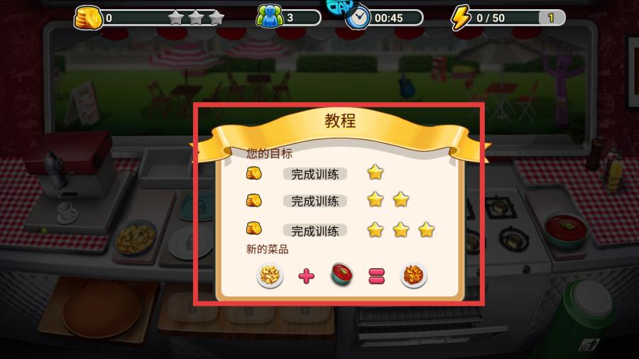 1、進入模擬餐廳經營,首先會彈出教程窗口,窗口里展示您的目標,還提示有新的菜品,仔細查看教程內容,明確游戲目標和新菜品制作方式。