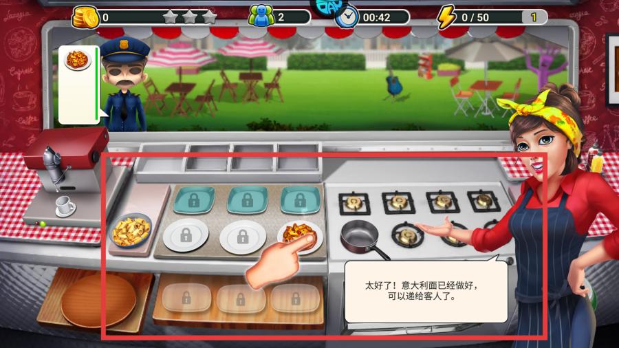 3、點擊食材后,進行烹飪操作,待制作完成,操作臺上會出現做好的意大利面,游戲里的引導提示,接著點擊做好的意大利面,準備遞給客人。