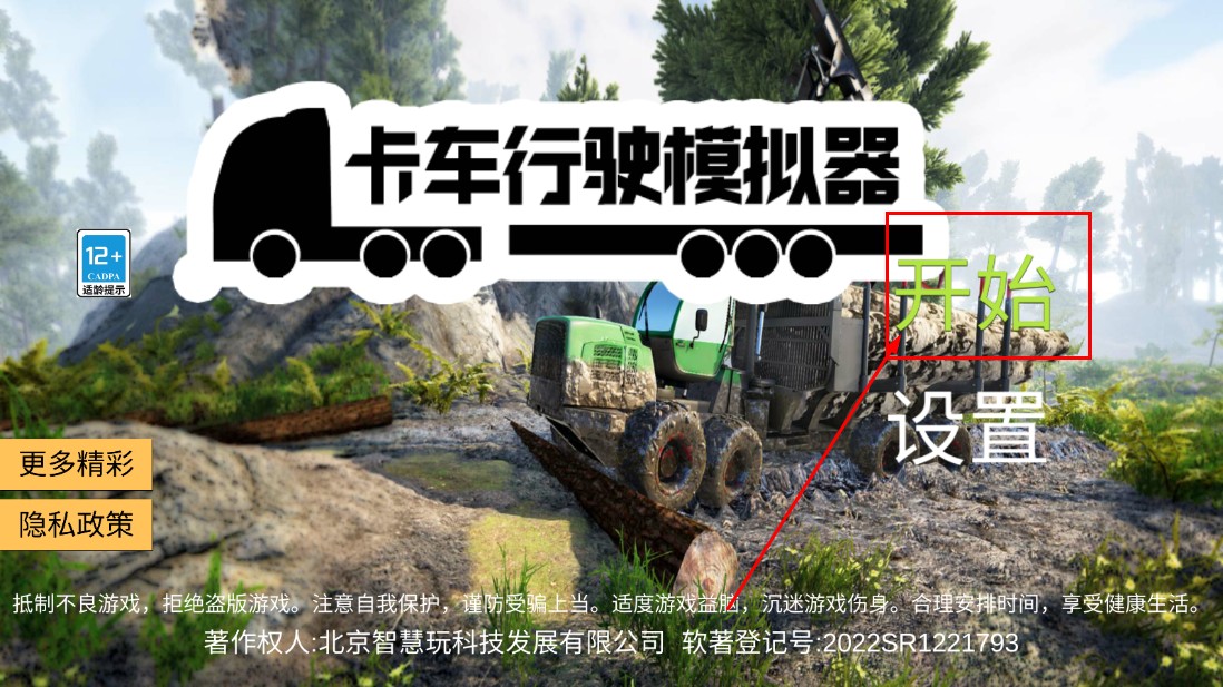 1、進入游戲會看到帶有卡車和山林背景的啟動界面,點擊“開始”按鈕,即可開啟卡車駕駛挑戰。