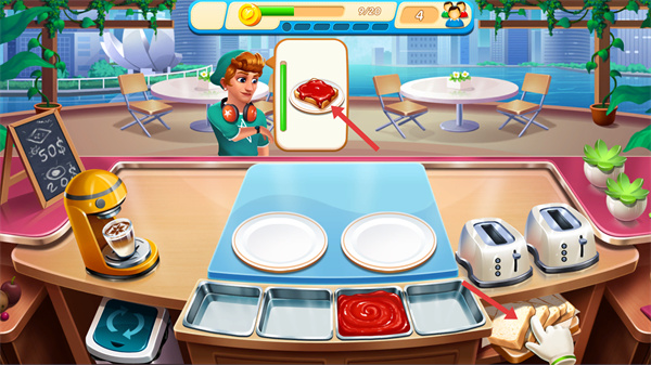 2、在烹飪界面根據訂單提示,先準備面包,然后選取紅色醬料,將醬料涂抹到面包上,完成這一步的烹飪操作。